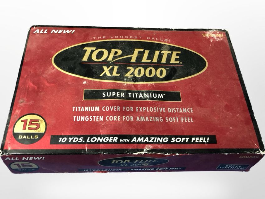 A golf bag containing a quantity of clubs including Arnold Palmer Deacon drivers, a box of golf balls.