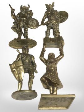 Two cast brass figures of vikings, a further depicting a knight and another of a highlander, tallest 23 cm