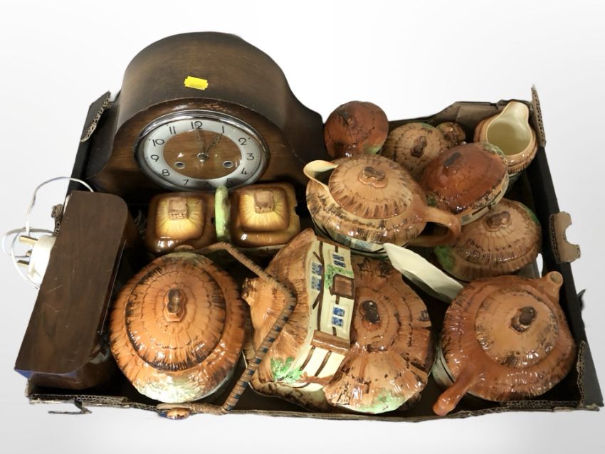 Two Art Deco mantel clocks and a quantity of cottage china. (1 box)