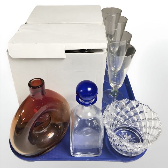 Two boxed Continental sets of six champagne flutes, further four flutes, decanter, bottle shaped vase and cut glass bowl