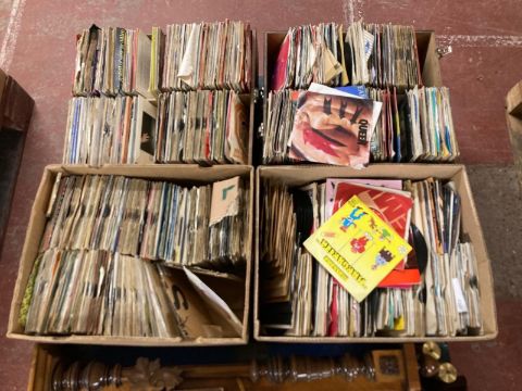 Four boxes containing 7" singles including Queen, late 20th century music, etc.