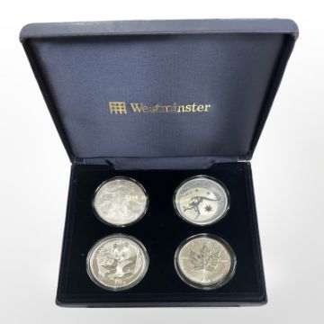 A Westminster 2005 Famous World Silver Coin Collection series, United States Eagle, Australian Kangaroo, Chinese Panda and Canadian Maple Leaf, each 0.999 fine silver, each 1 troy ounce.