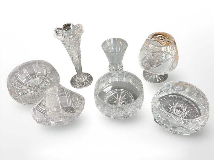 A group of cut crystal to include tall vase, fruit bowls, basket etc
