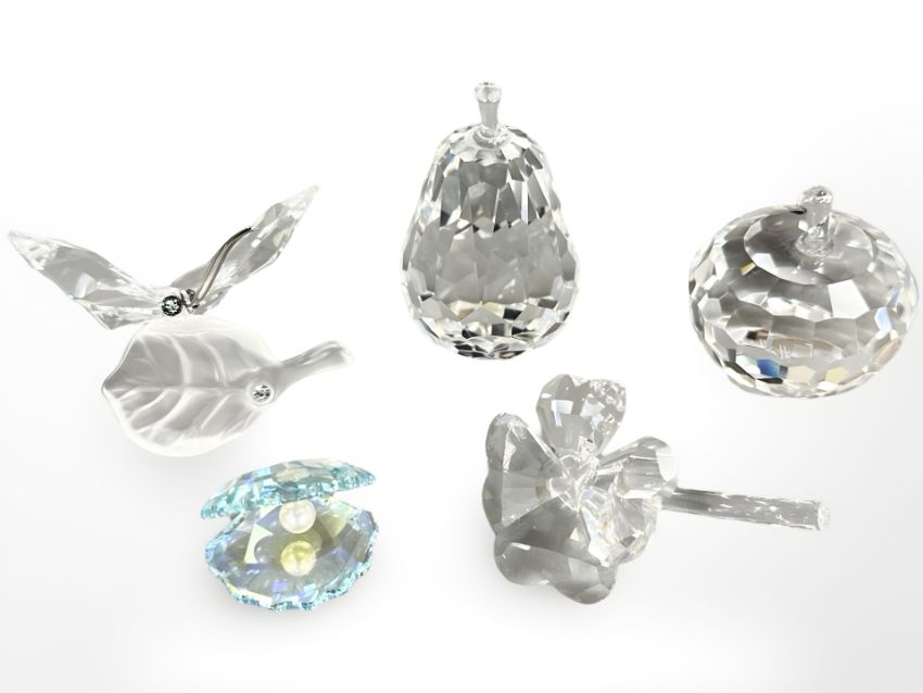 A group of decorative crystal ornaments including apple and pear, butterfly on leaf, flower etc (Three Swarovski and one other)