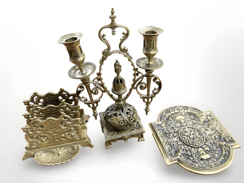 An antique-style brass letter rack, together with a 19th century brass plaque and a decorative continental brass candelabrum. (3)