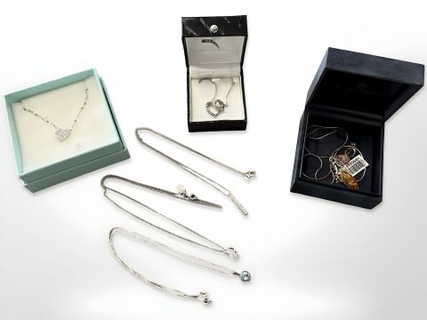 A group of Sterling silver jewellery including pendants on chains, amber pendant on chain, heart necklace etc.