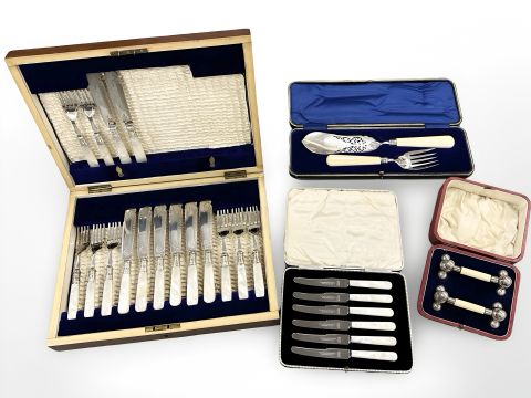Four cases of cutlery items to include mother of pearl-handled, ivorine fish serving set with silver collars, knife rests etc