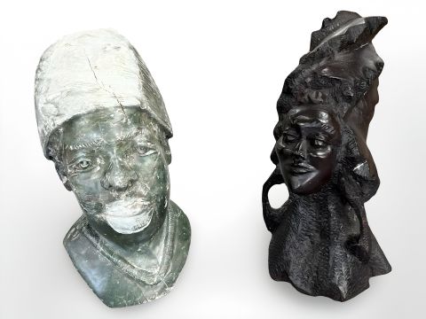 A carved green hard stone bust together with wooden carving similar, tallest 22 cm