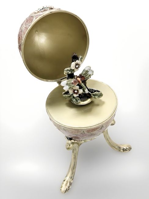 An enameled musical Fabergé-style egg on gilt metal stand.