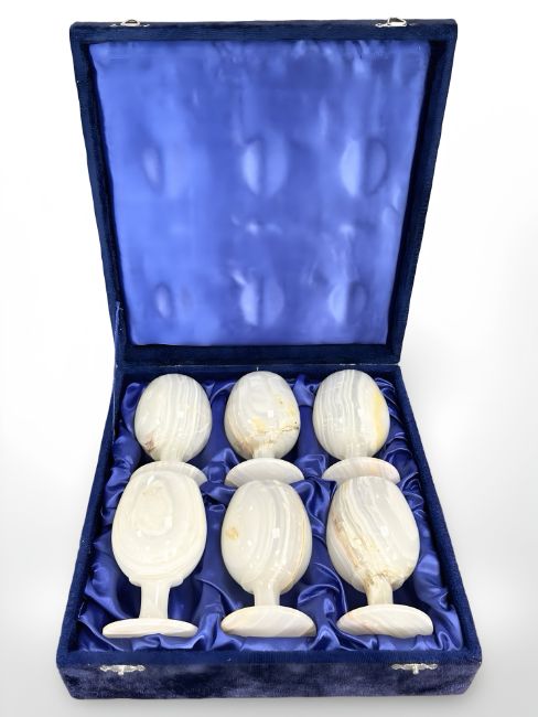 A set of six polished onyx goblets in case