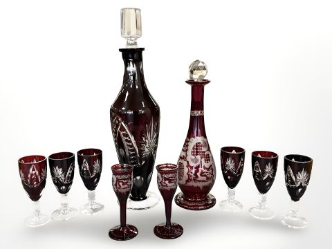 A group of etched ruby tinted glass including two decanters and eight glasses