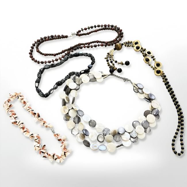 Five necklaces set with polished gemstone and beads, synthetic and natural stones. (5)