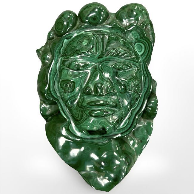 A large malachite plaque carved as a face, approximately 25 cm x 17 cm, 3.2kg.