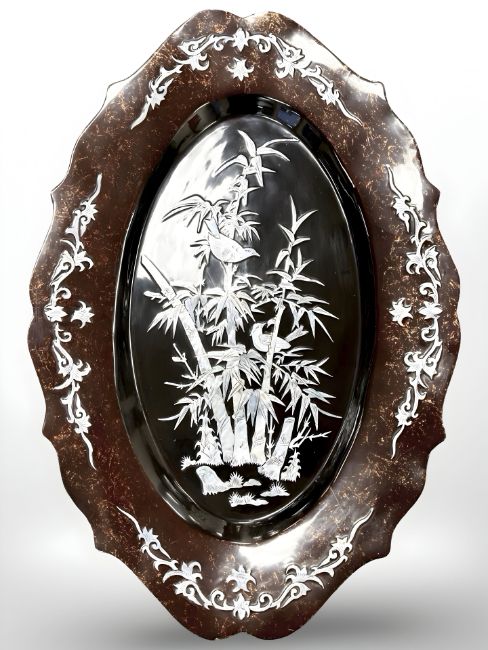 A Japanese mother of pearl lacquer tray, decorated with bamboo and birds, width 60 cm.