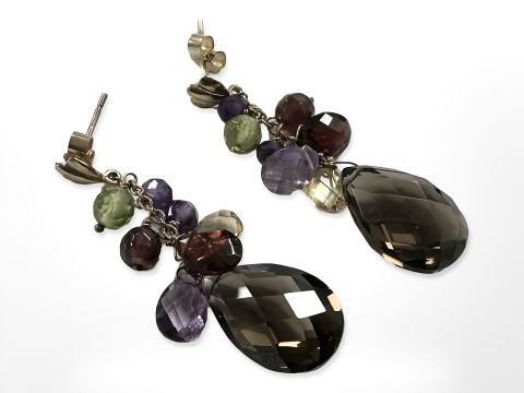 A pair of multistone briolette earrings mounted in 9ct gold, set with smokey quartz, peridot and garnet