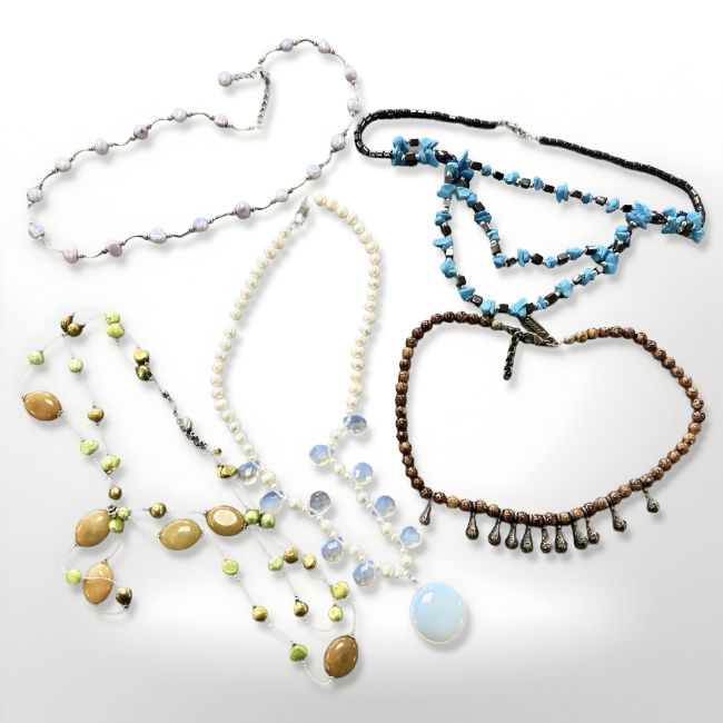 Five necklaces set with synthetic and natural stones, pearl etc. (5)