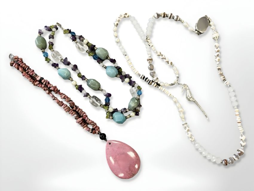 A pink rough cut gemstone necklace with polished lozenge pendant together with two further multi-stone necklaces, one with Seahorse pendant. (3)