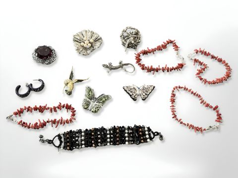 Four red coral bracelets together with a cuff bracelet, marcasite lizard brooch, butterfly brooches, further brooches and pair of earrings. (14)