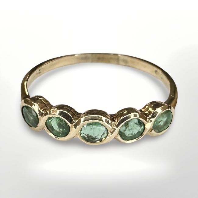 A 14ct yellow gold five stone emerald ring, size M.