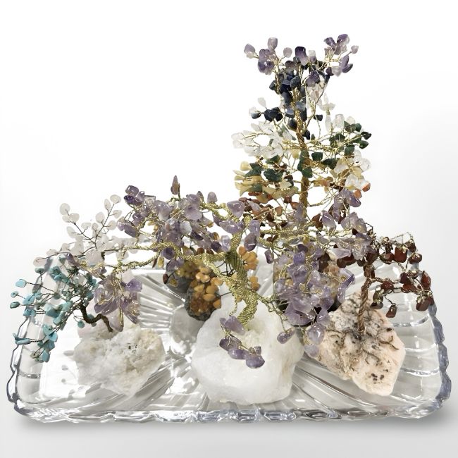 A group of six miniature gemstone tree ornaments, examples of Amethyst, Carnelian, Pink quartz, Amber, Sodalite etc on specimen rock bases, tallest 26 cm.
