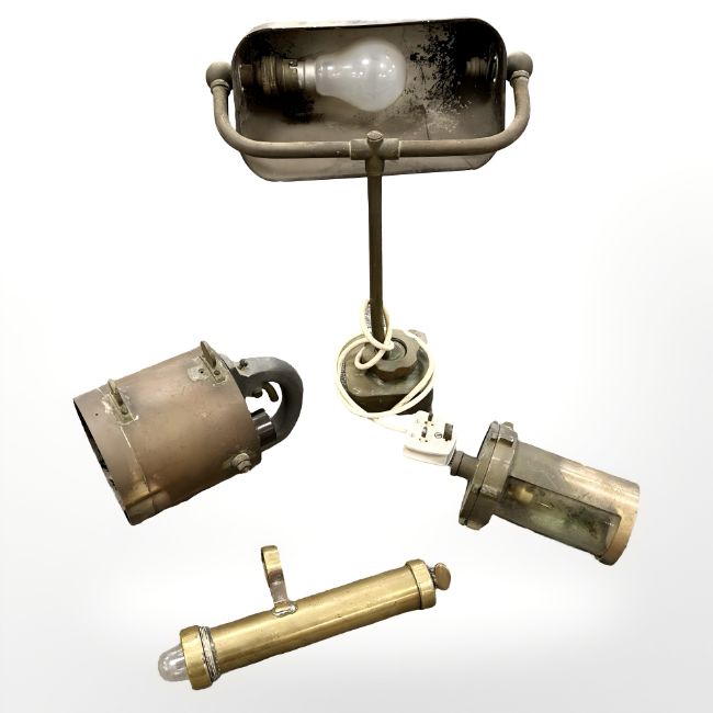 A banker's-style desk lamp, height 38cm, a copper electric torch, ship's bulkhead light and a further brass-cased light. (4)