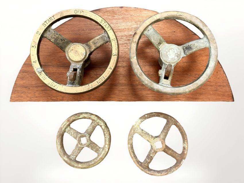 Two brass valve wheels mounted on a teak backing board measuring 60cm wide, and two further loose examples.