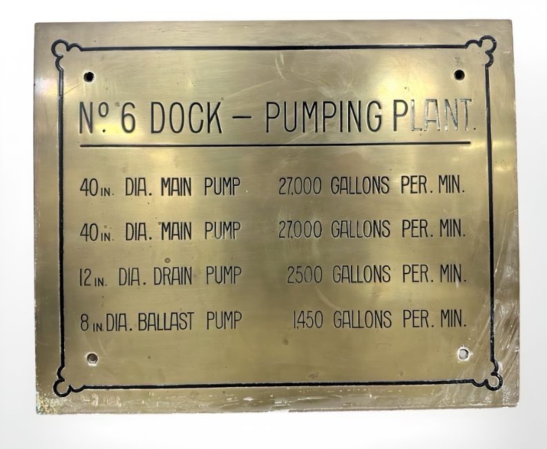 A brass rectangular plaque marked No. 6 Dock - Pumping Plant, 38cm by 31cm.