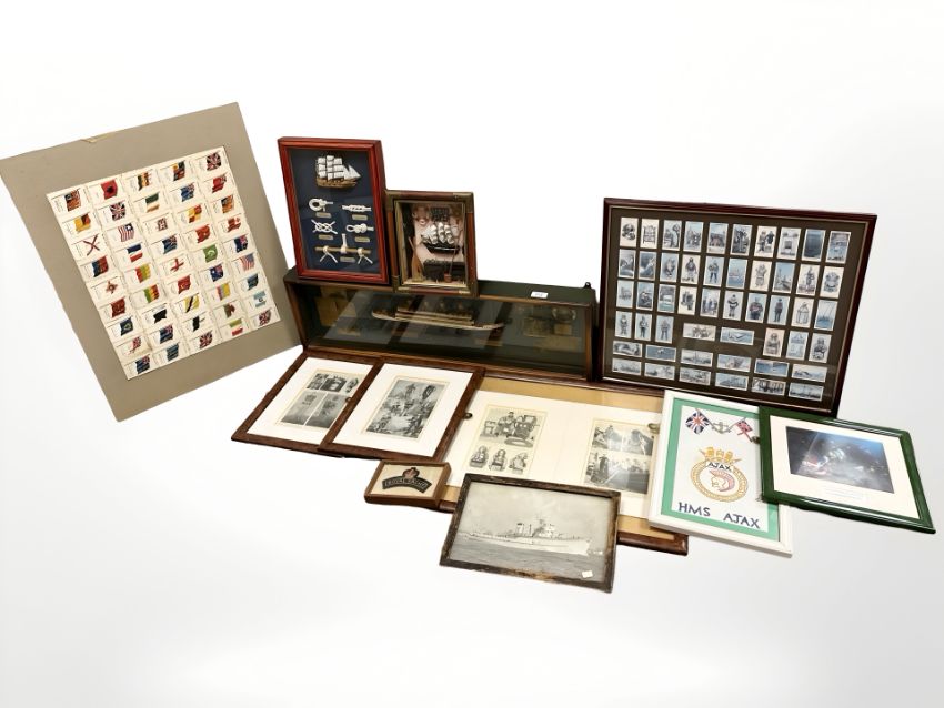 A group of ship and nautical knot montages, diving prints, Kensitas cigarette silks depicting various flags, reproduction cigarette card montage, all relating to diving, Royal Navy pictures, etc.