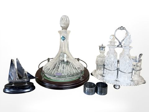 A small Maltese silver model of a sail boat stamped 917, an Edinburgh Crystal ship's decanter on stand, two EPNS napkin rings, and an EPNS and crystal cruet set. (5)