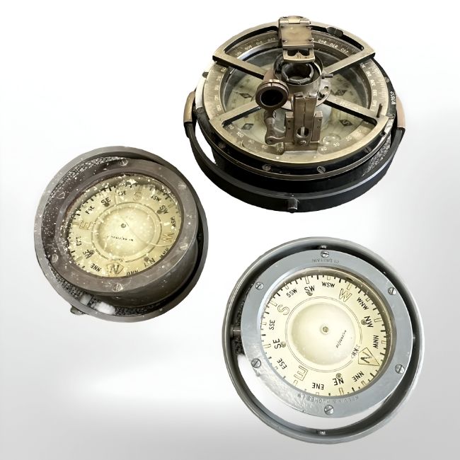 Three ship's compasses including a Kelvin Hughes example, largest 20cm diameter. (3)