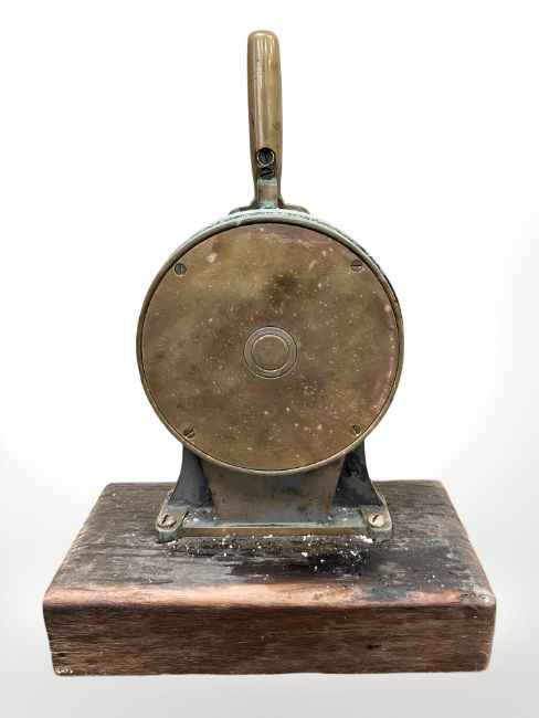 A patinated-brass Teleflex ship's telegraph, mounted on wooden plinth, height 37cm.