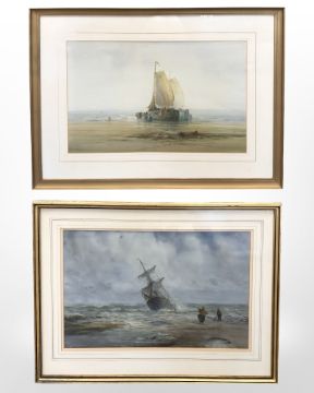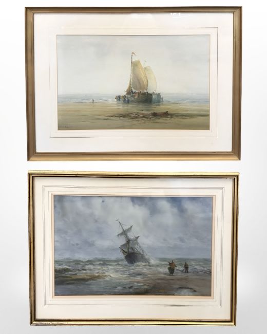 W Baker (fl. early 20th century) Fisher folk pulling boats out to sea at low tide, watercolour, 34 cm x 52 cm, together with a further watercolour by the same hand depicting figures salvaging a wreck in rough waters, 35 cm x 53 cm. (2)