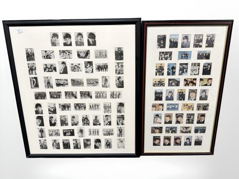 A montage of framed 1960's bubblegum cards, all relating to The Beatles, in two frames, 50 cm x 86 and 77 cm x 88 cm. (2)