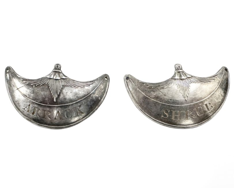 Two Georgian decanter labels 'Arrack' and 'Shrub', each 5cm wide.