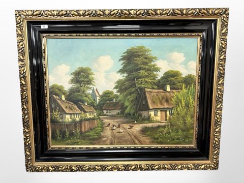 Danish School : Chickens on a road, oil on canvas, 87 cm x 65 cm.