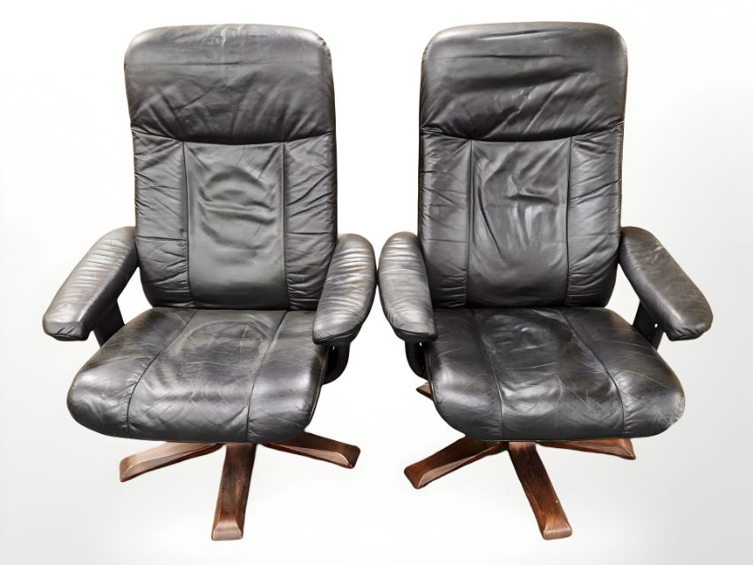 A pair of 20th century Scandinavian stained bent wood black leather swivel armchairs