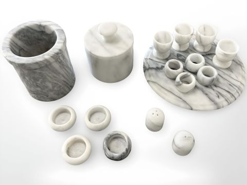 A group of white marble kitchen ware items including storage jars, serviette rings, etc