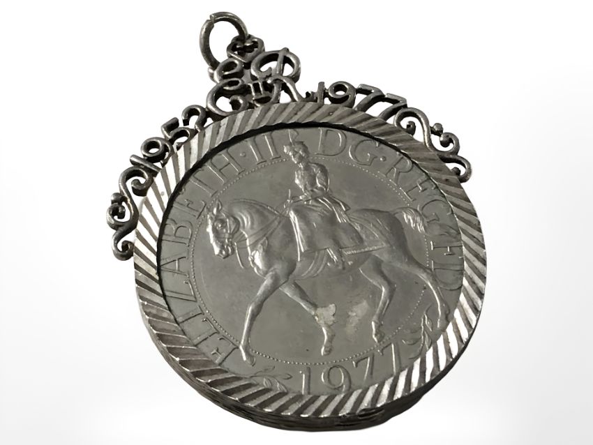 A Pinchbeck chain and a 1977 Jubilee crown in silver pendant mount.