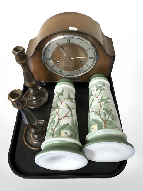 A walnut mantel clock, a pair of turned oak candlesticks and a pair of painted opaque glass tapered vases.