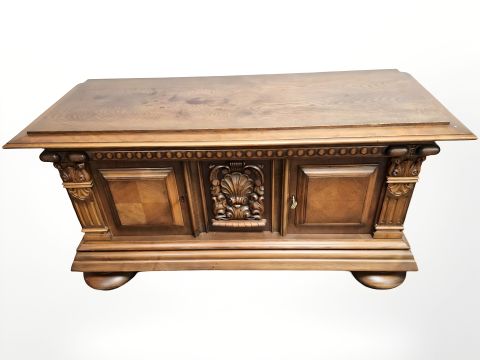 A 20th century continental carved and panelled oak low sideboard on bulbous feet, 138 cm x 55 cm x 71 cm.