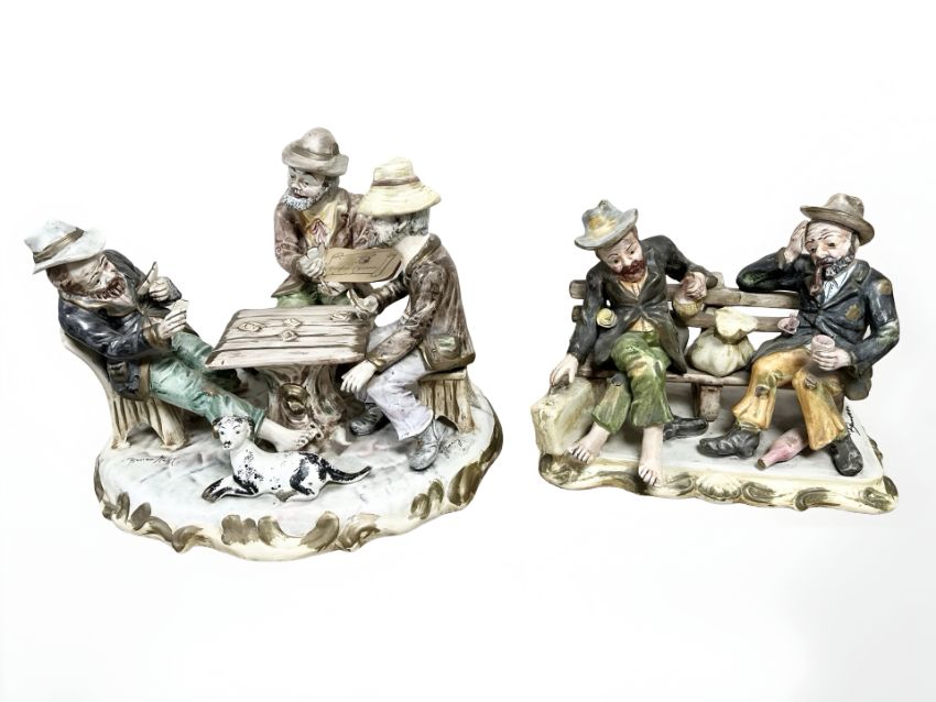 Two Capodimonte figure groups of tramps, largest 39 cm wide