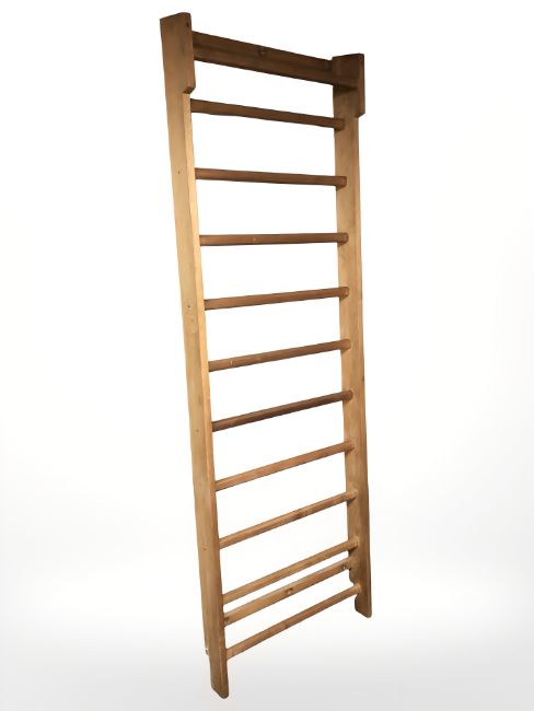 A Scandinavian teak wall rack, 75 cm wide x 15 cm deep x 228 cm high