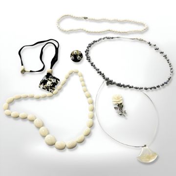 A pearl necklace on gilt metal claps, length 46 cm, together with three further necklaces, Murano glass pendant on ribbon with matching ring and a floral leaf brooch. (7)