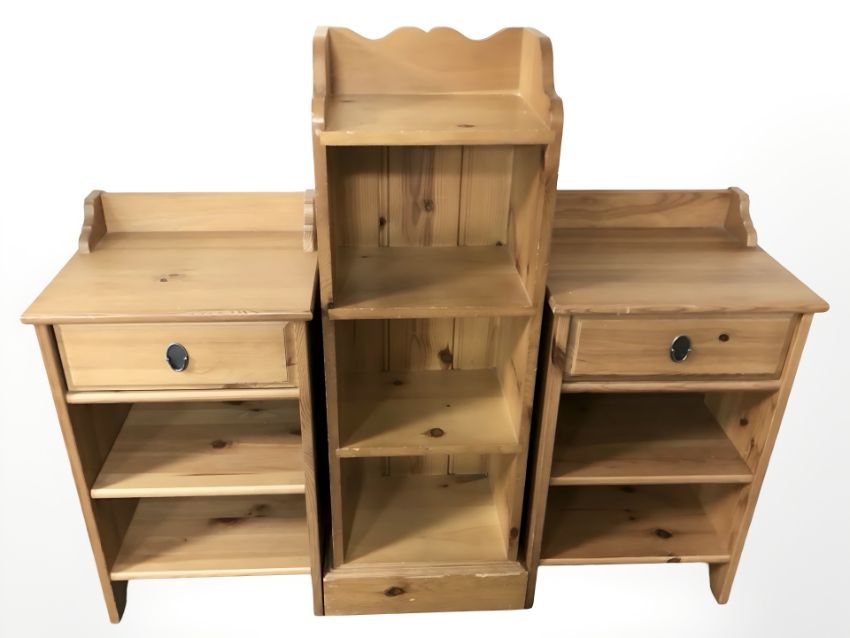 A pair of modern pine bedside stands and an open bookcase