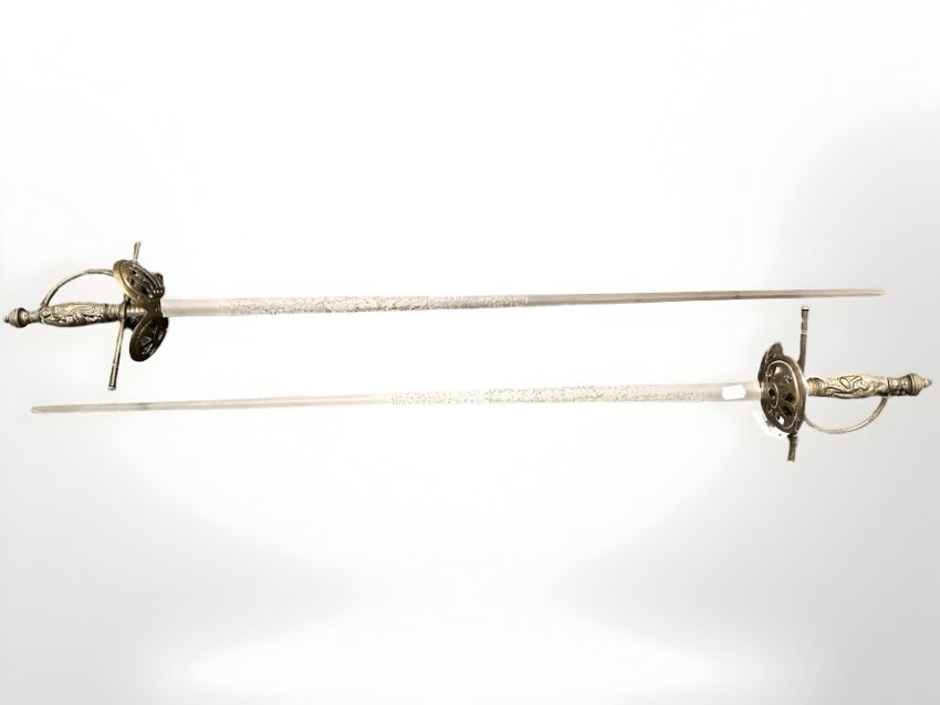 A pair of 19th century Continental court swords, with 83 cm engraved blades, clam shell hand guards and cast figural grips