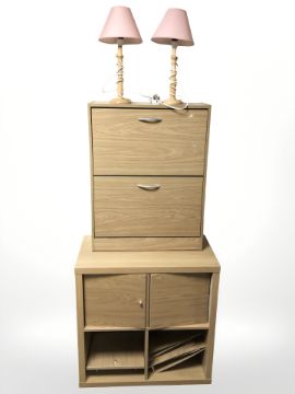 An oak effect cube shelving unit, similar shoe cabinet and two lamps