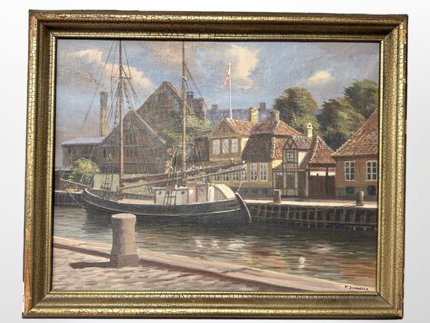 F Svendsen : Boat on a canal, oil on canvas, 44 cm x 34 cm.