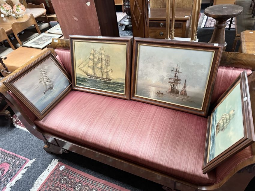 Four contemporary oil on canvas paintings of tall ships, largest 40 cm x 49 cm