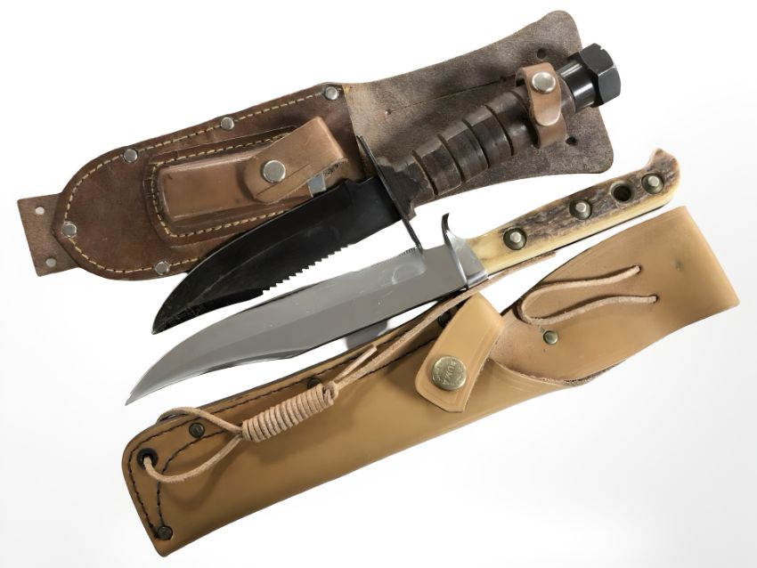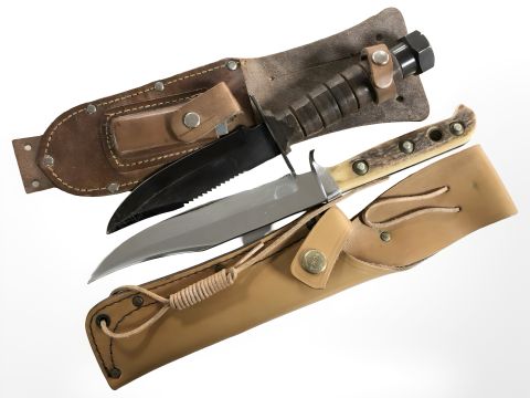 Two Bowie-style knives in leather sheathes, largest 27 cm long.