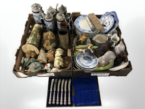 A group of pottery steins, figurines, blue and white dinner wares, white metal scroll holder. (2 boxes)